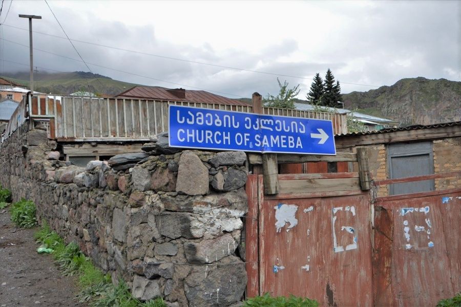 Il sentiero per raggiungere la chiesa di Tsminda Sameba inizia subito dopo la piazza del paese e dopo l’attraversamento di un fiume frizzante e rumoroso, girando a sinistra verso le pendici del bosco…